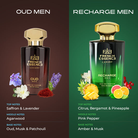 Oud + Recharge Premium Perfume Set for Men 60ml+30ml (Pack of 2)