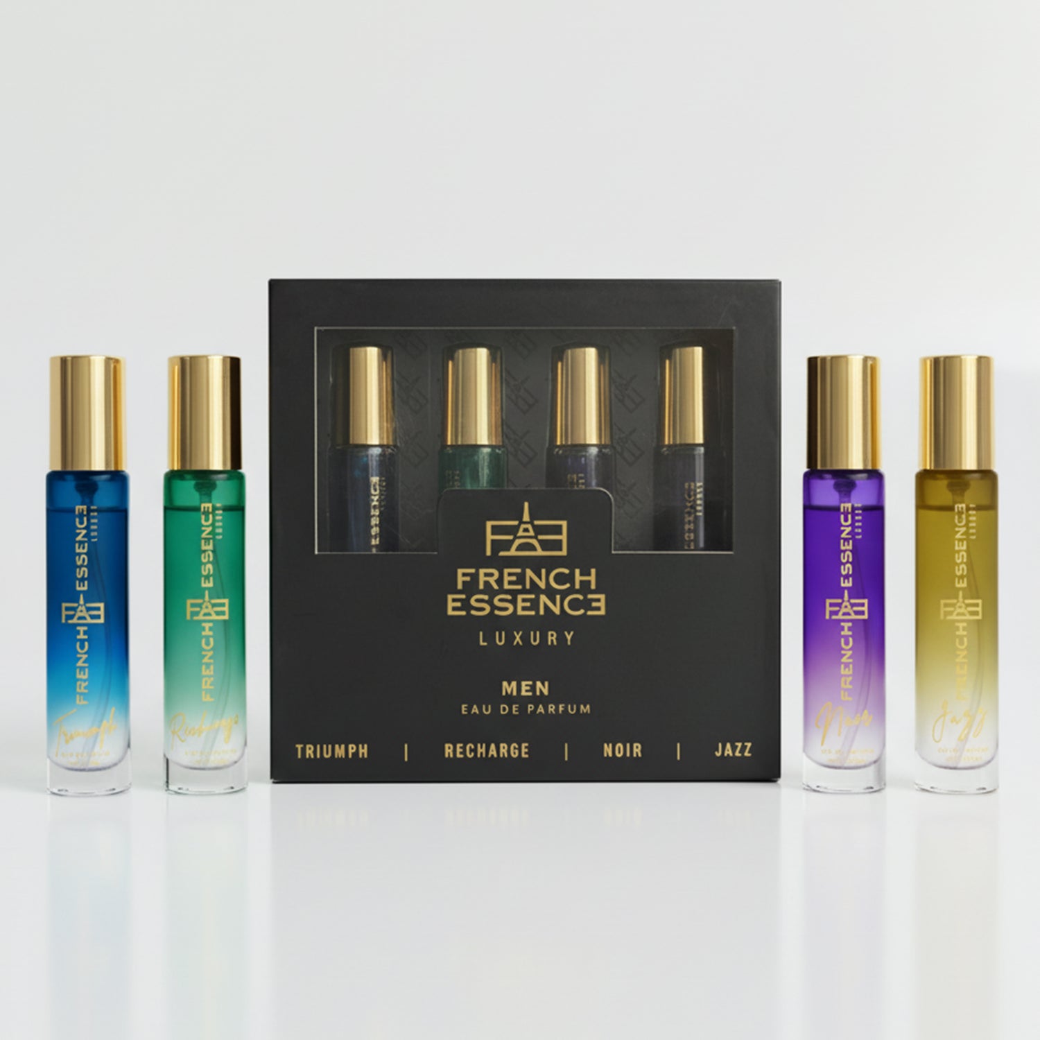 Immerse yourself in refined masculinity with our luxury perfume combo pack for men, featuring four unique scents: Tribute, Recharge, Noir, and Jazz. This curated collection elevates the art of gifting, offering a symphony of fragrances designed for the modern man’s active lifestyle. Whether it’s for a thoughtful surprise or special occasion, each scent—from the bold Tribute to the energizing Recharge, mysterious Noir, and timeless Jazz—makes every moment an unforgettable olfactory adventure. Experience the perfect blend of luxury and masculinity with our exclusive men’s perfume gift set.