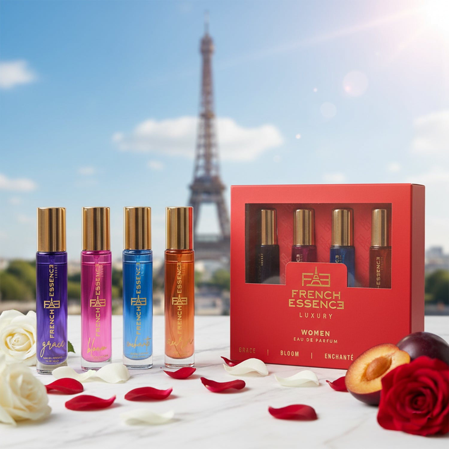 Experience the epitome of elegance with our Luxury Perfume Gift Set for Women, featuring four enchanting fragrances: Grace, Bloom, Enchante, and Aura. Each scent is carefully curated to captivate the senses and reflect timeless luxury. This exclusive perfume combo is perfect for thoughtful presents or special occasions, making it one of the best perfume gift sets for her. Embrace the art of giving with our exquisite perfume gift packs, and make every moment memorable. Elevate your gifting experience today!