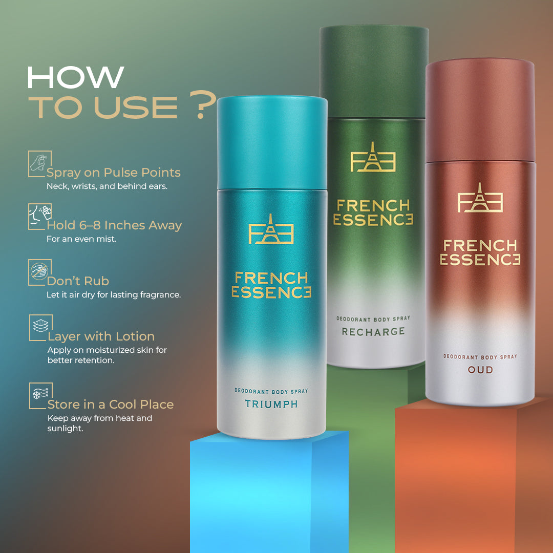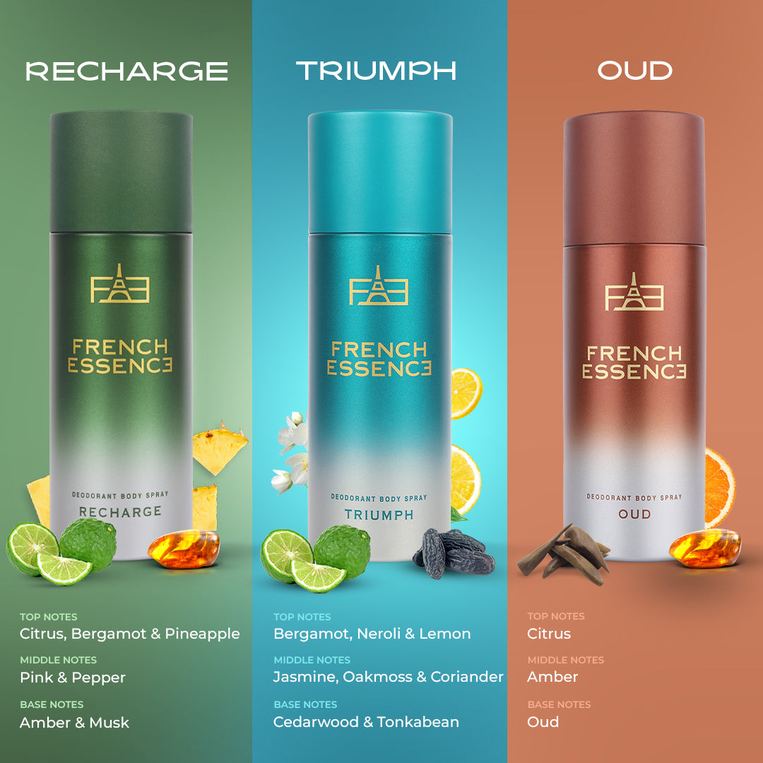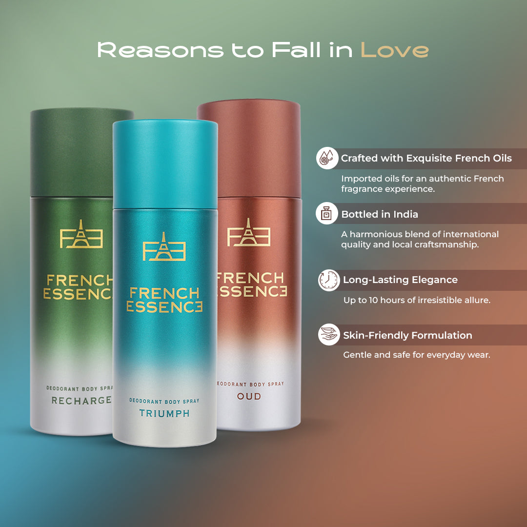 Introducing the French Essence Unisex Deodorant Body Spray Combo Pack, featuring three captivating 50ml fragrances: Oud, Triumph, and Recharge. This versatile trio blends sophistication with style, offering a revitalizing scent for every occasion. Recharge invigorates with vibrant energy, Triumph exudes confidence, and Oud adds a rich, exotic touch. Portable and perfect for any mood, this limited-edition pack celebrates self-expression with every spray, ensuring you stay fresh and stylish wherever you go.